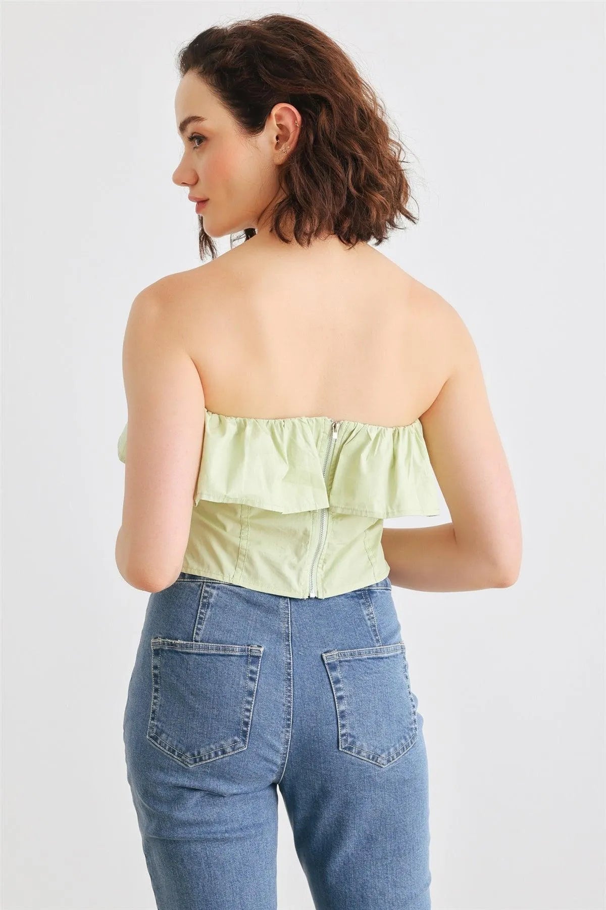 Light Green Cotton Strapless Flared Corset Tube Crop Top