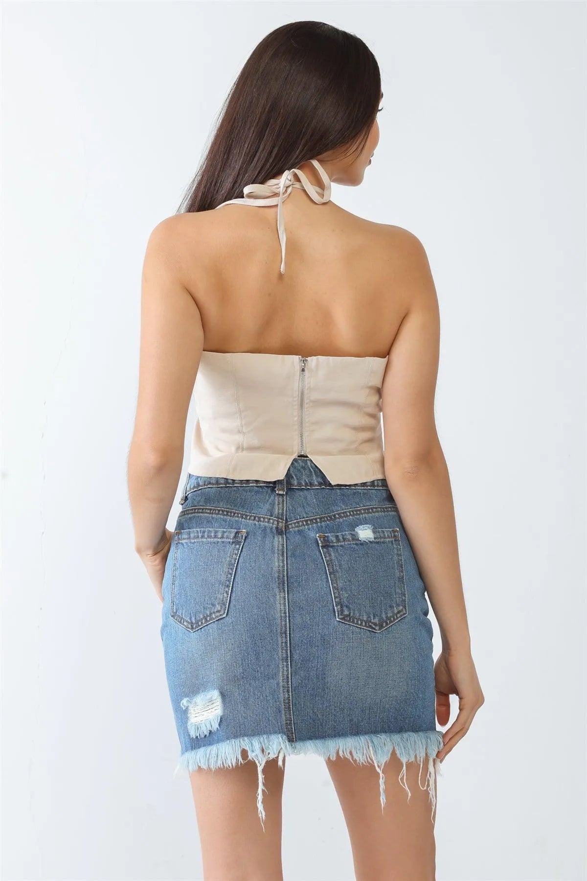 Taupe Sleeveless Halter Neck Strappy Crop Top